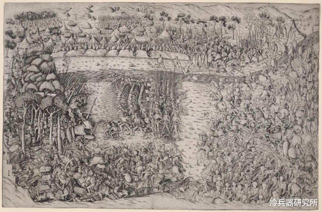 如此这般被动挨打的“叠阵”令瑞士步兵开怀大笑,他们一方面以长矛手正面迫近,一方面从抽出大约300人规模的戟兵和双手剑士作为突击部队,出其不意地骤然投入,打了意大利人一个措手不及。