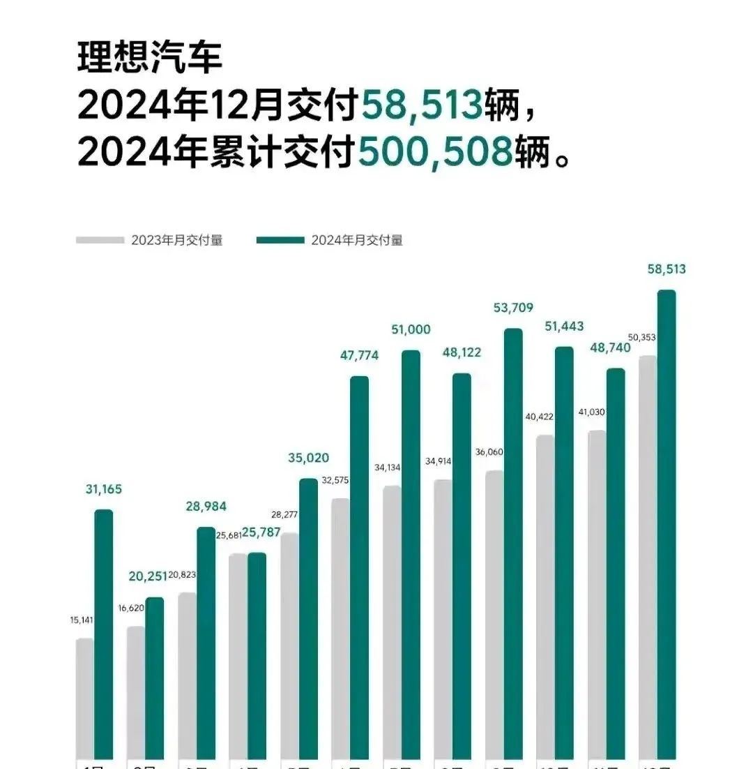 数据显示,2024年12月,理想汽车交付新车58513辆,同比增长16.2%;2024年全年共交付500508辆,是新势力中首个年交付50万辆的品牌。