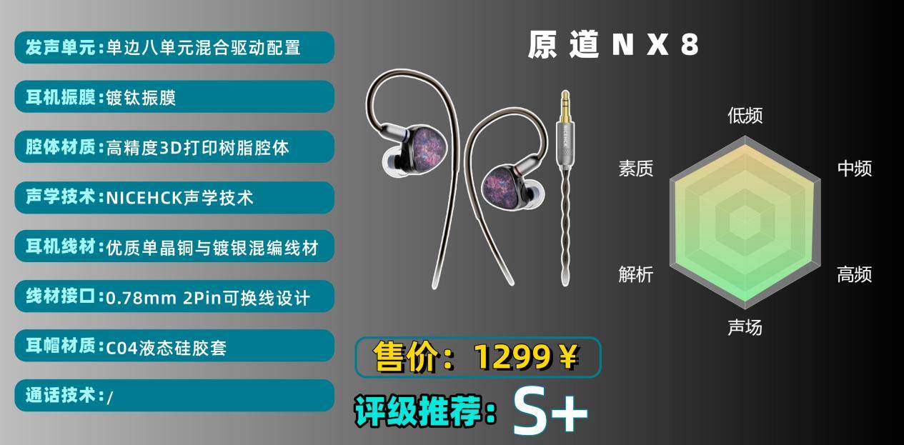 搭载 10mm 镀钛动圈 + 6 颗动铁 + 1 颗压电陶瓷的八单元配置,支持三种可换声学导管调音。整体偏向中性风格,低频量感充足、下潜适中,中频人声密度扎实,高频顺滑无刺耳感。缺点是声场表现一般,横向延展不足,大编制音乐的分离度欠佳。