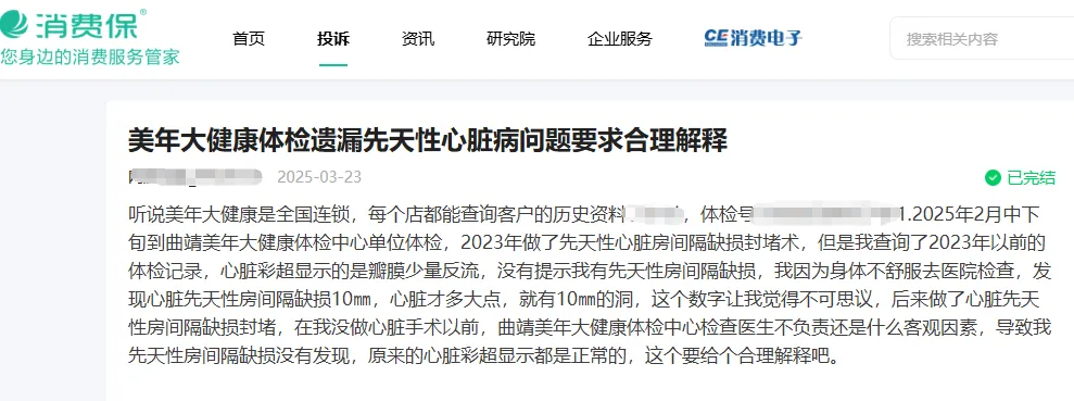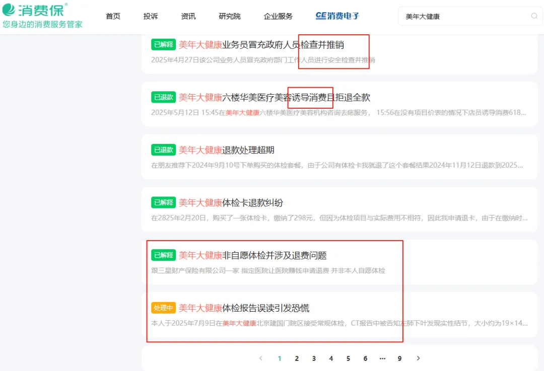 此外,记者在消费保平台搜索发现,除爱康国宾之外,另一知名头部连锁健康体检机构美年大健康投诉也频频出现。