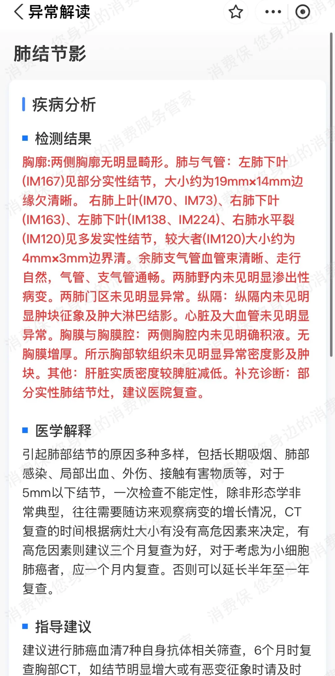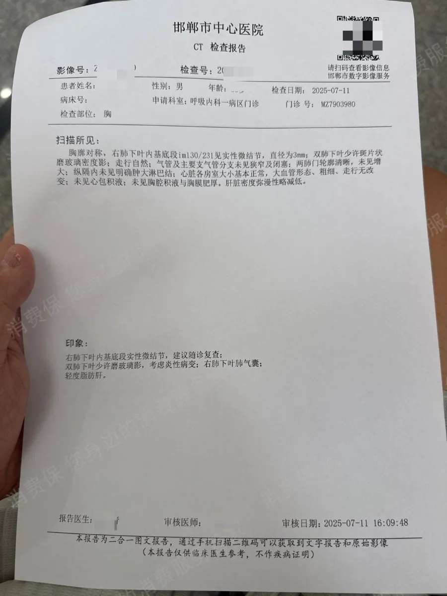 近日,唐先生在消费保平台投称,7月9日,他在北京美年大健康建国门院区接受常规体检。CT报告显示其左肺下叶出现19×14mm“实性结节”,因报告中出现的“实性肺结节灶”“肿块”“建议医院复查”等字样,让唐先生及家人陷入极大的精神压力和恐慌中。