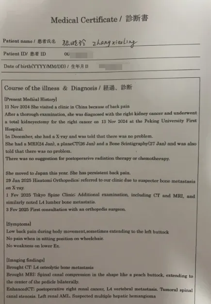 2024年,张晓玲换了一家体检机构,结果在腹部彩色超声检查时被发现:“右肾囊肿,右肾可见一低回声,大小:3.5cm× 2.8cm,呈分叶状,血流信号丰富”,并被建议到医院进一步检查。2024年10月,张晓玲在北京大学国际医院被怀疑“右肾透明细胞癌”,进行右肾摘除手术后,病理显示为“透明细胞型肾细胞癌”。由于手术后仍感觉身体不适,张晓玲在2025年2月又到国外的医院进行了检查,结果被确诊为“肾癌骨转移”,而且骨转移已经达到了晚期程度。