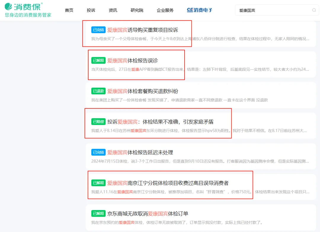 近年来,爱康国宾体检旗下的体检机构多次被投诉存在“体检报告不准确、误诊”“漏诊”“检查敷衍”等现象。在消费保投诉平台,以“爱康国宾”为关键词进行搜索,相关投诉屡见不鲜。