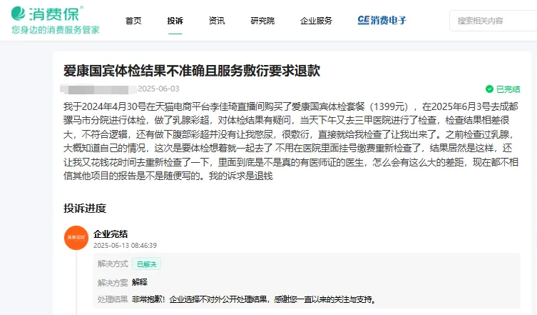 近日,李女士向消费保投诉平台反馈:2024 年 4 月 30 日,她在李佳琦直播间购买了 1399 元的爱康国宾体检套餐;2025 年 6 月 3 日在成都骡马市分院体检时,发现乳腺彩超结果与当天下午三甲医院的检查结果差异极大,且不合逻辑。此外,该分院在为其做下腹部彩超检查时,未要求憋尿,检查过程也较为敷衍。因此,她对分院医生的资质及其他项目报告的真实性提出质疑,要求退款。目前,李女士投诉已解决。