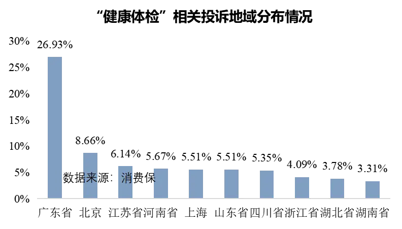 据消费保数据显示,在“健康体检”行业投诉用户分析中,呈现三大显著特征。首先,地域集中度高。广东省投诉量占比高达26.93%,远超其他地区,位居首位;北京市(8.66%)和江苏省(6.14%)分列第二、三位。