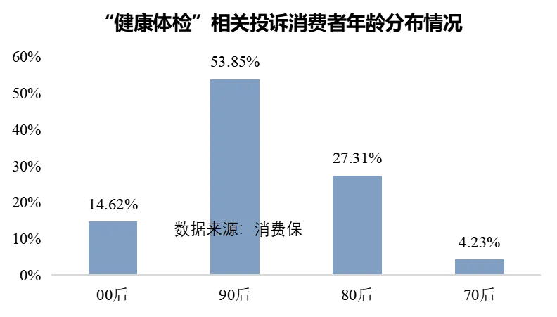 一定程度上,也体现出作为“上有老下有小”的家庭支出主力,80后、90后既是企业团检和高端体检套餐的核心消费群体,又具备成熟的网络维权意识和渠道,因此成为健康体检投诉的高发人群。