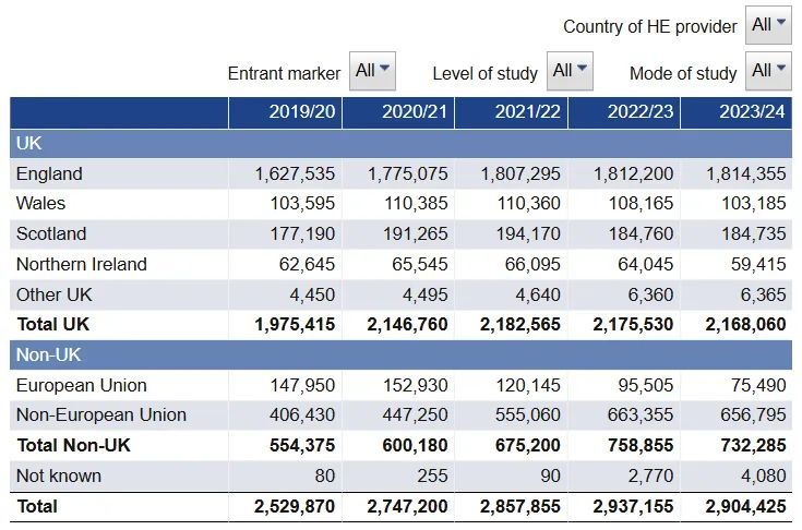 在2023/24学年,英国高等教育机构的总学生人数为2,904,425人,相较于上一年减少了32,730人,降幅约1%。英国本土学生入学人数为2,168,060人,较上学年减少了7,470人,已连续两年出现下降趋势。