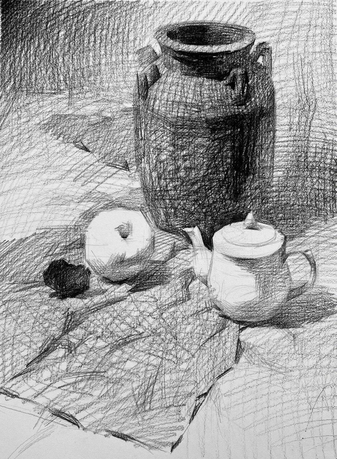 搜索关键词: 五个组合静物素描步骤图,深色罐子白色茶壶苹果莲蓬玻璃杯高脚杯,白色陶瓷茶壶素描,陶罐质感素描,静物素描竖构图,素描黑白灰层次,静物素描照片对画,素描静物照片对画,小红书:1080994469,来源阿冠(爱车版)