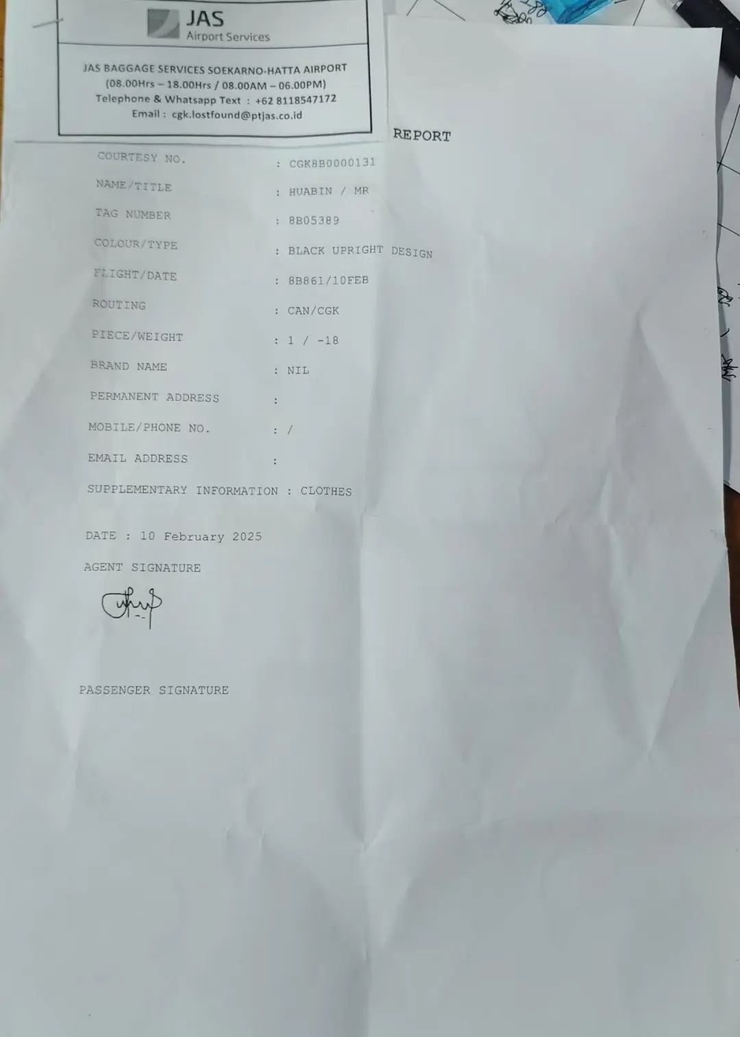 有旅客从雅加达中转前往三宝垄至今同行8人都未收到行李
