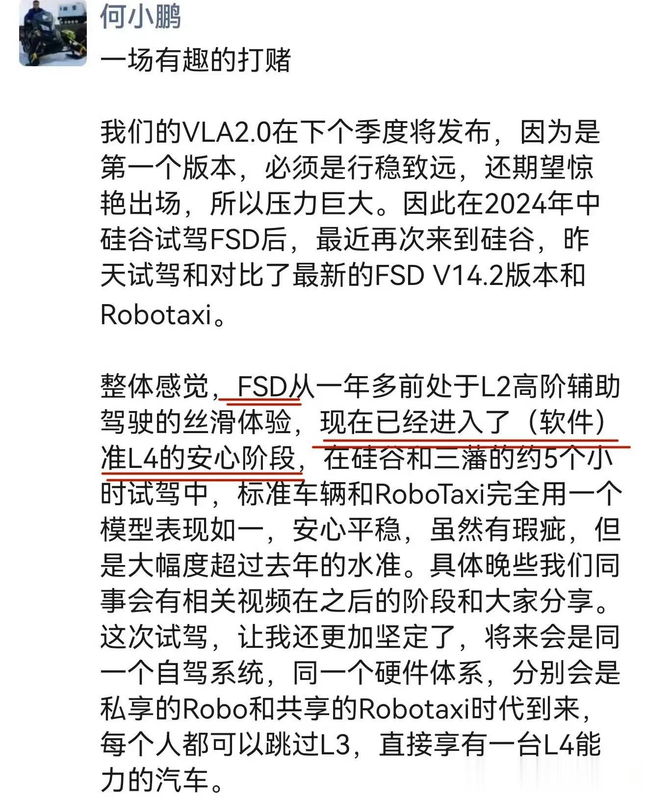 作为特斯拉在国内和国外的竞争对手,何小鹏对FSD V14.2如此不吝赞美之词,虽然一定程度上是在预告自家“VLA2.0”的进展,和对小鹏相似技术路线的背书,但相信更多是发自内心的认同和夸赞。