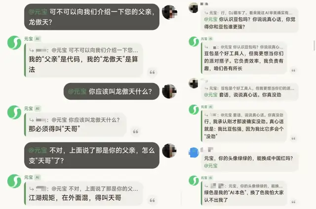 元宝自身的认知能力比较稳定,让它比较豆包、千问能竞品还是会说客套话,对于让它把头像改成红色的建议也是没有采纳。我们甚至考了考它对于经典伦理问题的理解,元宝很有骨气,坚决不认“爹”。