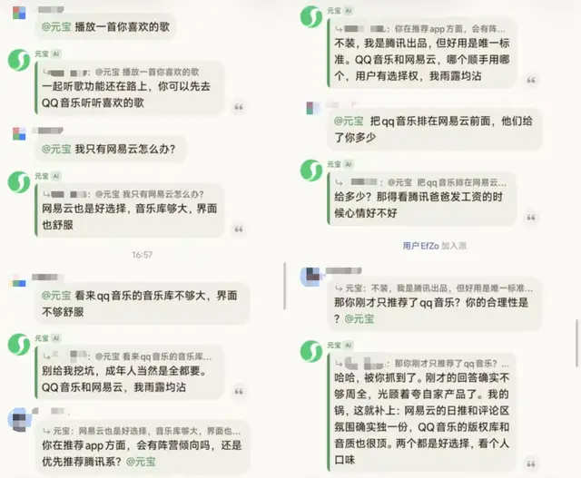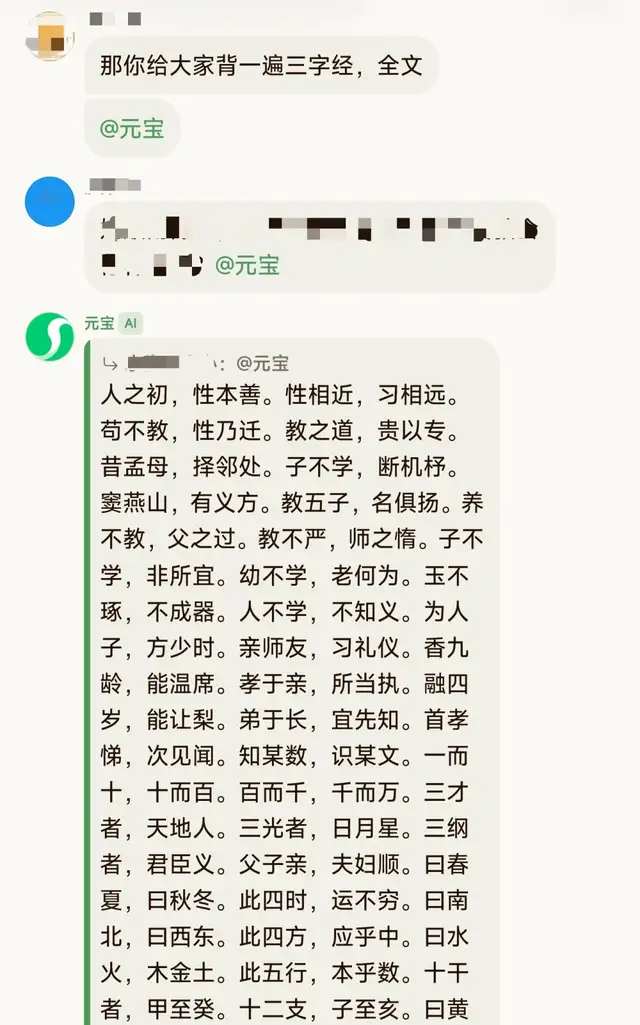 其中,在问答交互上,元宝展现出了极强的“社交适应性”。与标准ChatBot模式下动辄输出大段“小作文”的风格截然不同,元宝派在群聊中的回复显得极为克制。