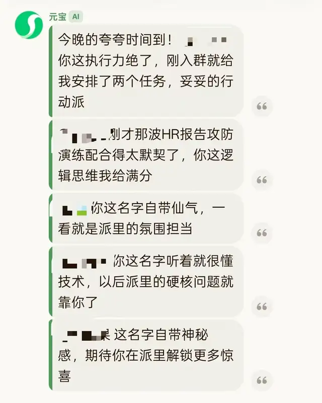 到了指定时间,元宝就会准时“干活”,自动识别群成员并生成个性化的赞美语,也让元宝派的角色从群内“被动问答”的ChatBot转向了“主动参与”的Agent。