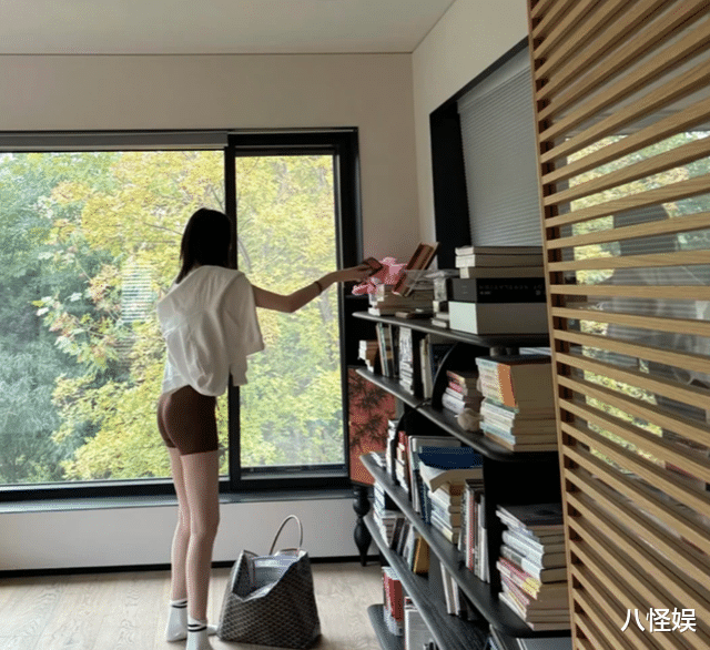 下图中站在书柜前弯腰整理东西的何穗,腹部都不见一丝赘肉,妥妥的辣妈一枚。