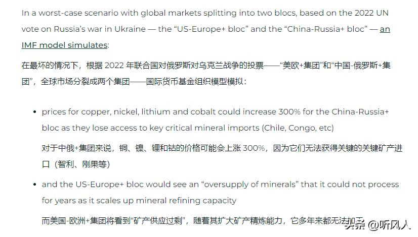 国际货币基金组织(IMF),就曾做过模型预测,如果市场分裂为“美欧+”和“中俄+”两大集团,铜、镍、锂、钴价格可能暴涨300%,而美国连加工能力都跟不上,谈何自给自足?