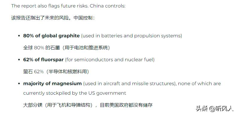 而美国呢?镓、锗、钨完全没有国内生产能力,镁、石墨、萤石连一点战略储备都没有!