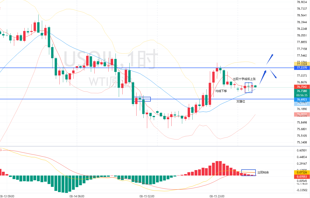原油日K图中,近期油价呈下降趋势,K线未能突破前期高点形成回落,跌至支撑区后反弹形成向上趋势。昨天油价开盘价:76.358收盘价:76.825可以看出是以一条阳线收盘。均线MA5与MA20形成金叉持续向上。MACD指负值区中快慢线形成金叉。可以看出是有利多头。