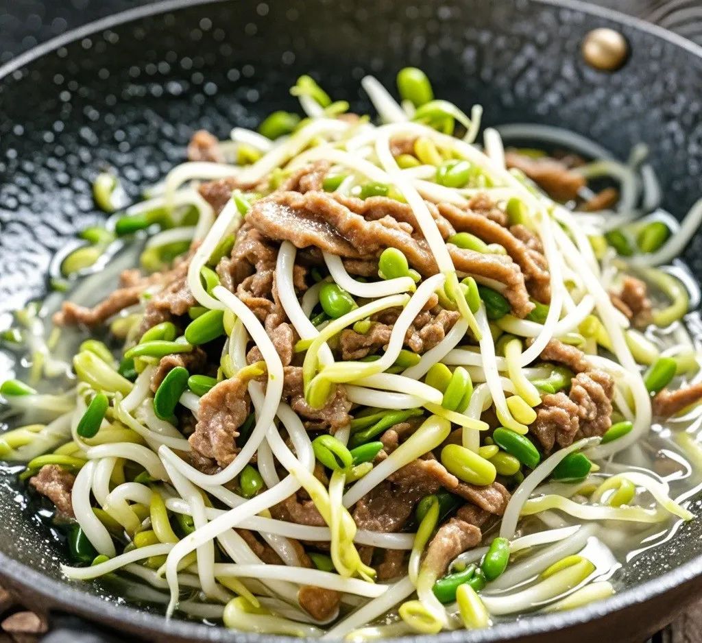 所需材料:绿豆芽300克、猪里脊肉100克(切丝)、蒜末、姜末适量、盐、生抽、料酒各适量、淀粉适量、食用油适量