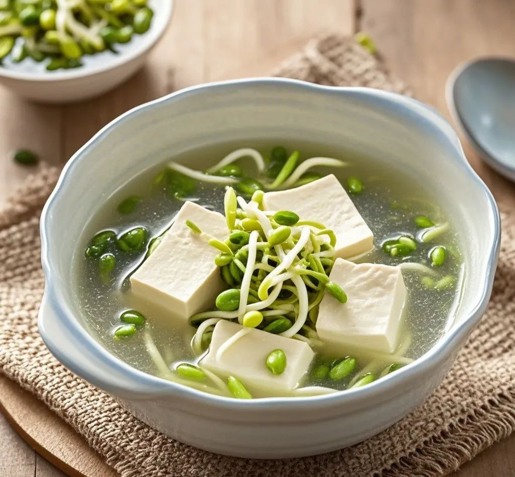 所需材料:绿豆芽300克、嫩豆腐200克(切块)、姜片适量、盐、鸡精各适量、清水适量、葱花少许