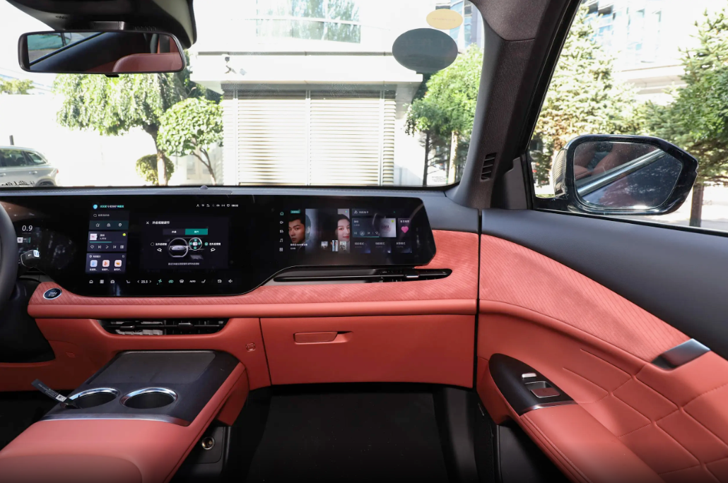 进入车内,10.25英寸液晶仪表盘、14.6英寸中控显示屏、12.3英寸副驾娱乐屏,三联屏的设计风格从观感上就给到极强的科技感,而实际体验时,这三块屏幕之间的交互也十分便利,导航信息可通过三指分屏分享给主驾屏幕,中控与副驾之间的娱乐功能也能在两个屏幕之间无缝流转。