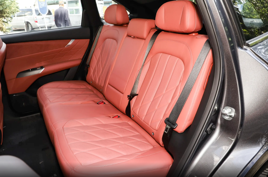 乘坐空间方面:得益于1910mm的车宽和2800mm的轴距让车内拥有宽敞的乘坐空间,体验者身高为178cm(体重为170斤)坐入主驾驶位置并调节好座椅后,头部空间可以剩余1拳三指。来到后排,头部可以剩余4指,腿部则有2拳以上空余,同时中间地板为纯平,对于乘客也非常友好。此外,后排座椅靠背还支持多级可调,提高了乘坐时的舒适度。