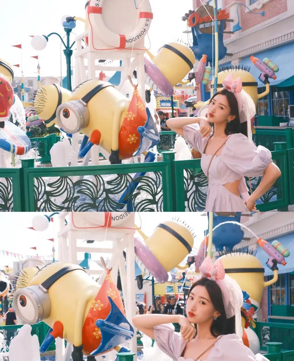 她与这些憨态可掬的小黄人互动,时而模仿它们的搞怪动作,时而与它们合影留念,欢笑声在乐园里回荡。