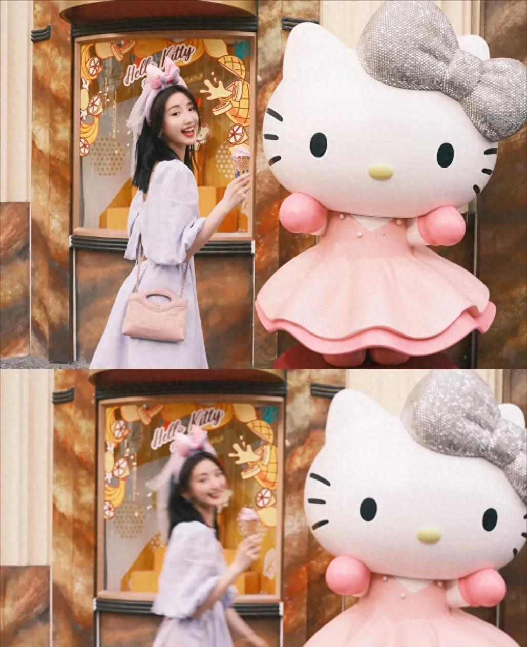 她手持冰淇淋甜筒,与可爱的Hello Kitty雕像合影,画面温馨美好。