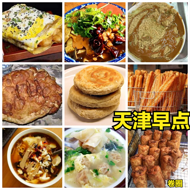 煎饼果子、炸糕、嘎巴菜、豆腐脑、卷圈、烧饼、大饼鸡蛋、烧饼里脊、云吞、面茶……