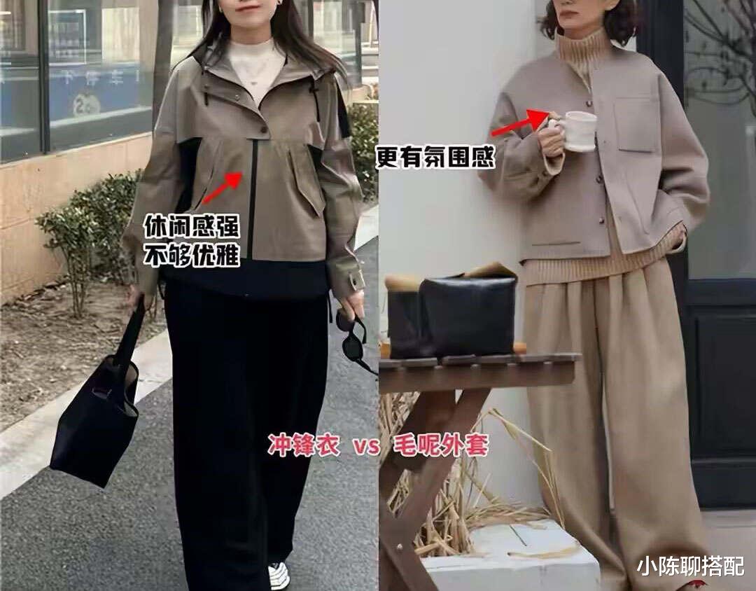 ↓面这一组对比图就做出了很好的诠释,冲锋衣虽有了不错的舒适度,但太过休闲反倒会物极必反,然而,旁边的外套毛呢外套则就不一样了。