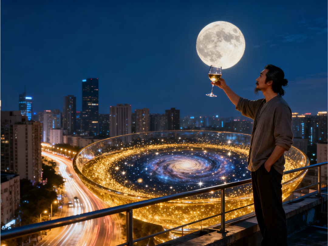 当你迷茫到怀疑人生,请启动'李白模式':深夜上顶楼天台,把路灯当星星,把车流当银河。此刻你脚下的烦恼,不过是银河系旋臂上的小尘埃。记住这个宇宙公式:视角每升高一公里,焦虑就蒸发一吨。