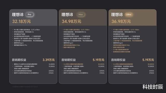 理想i8为用户提供Pro、Max、Ultra三个版本选择,三个版本均标配双电机智能四驱、双腔魔毯空气悬架、三元锂5C超充电池和ATL全天候激光雷达等核心配置。