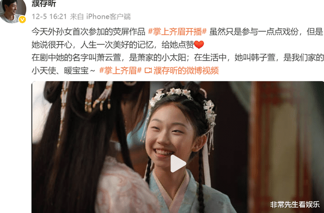 12月初,72岁的老戏骨濮存昕,突然在社交平台特意发了一条动态,为他11岁的外孙女韩子萱加油打气。