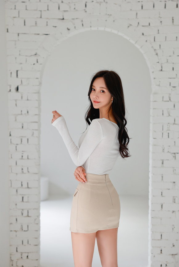 搭配的米色短裙是这套造型的亮点之一。短裙的设计简洁大方,高腰设计不仅拉长了腿部线条,使女孩的双腿看起来更加修长,还巧妙地突出了她的腰部曲线。米色作为一种中性色调,给人一种温暖而舒适的感觉,非常适合展现都市女性的成熟魅力。短裙的长度刚好到膝盖上方,既展现了女孩的腿部线条,又不失得体。