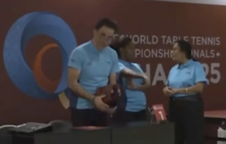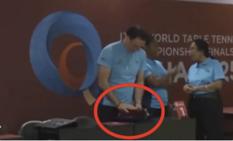 检测工作在有条不紊中推进,不久后,四名运动员的球拍检测宣告完成。裁判 A 将整理得整整齐齐的四支球拍,郑重其事地交到了裁判 B 手中。随后,裁判 A 因事暂时离开,此时,裁判 B 独自站在放置球拍的桌前,周围的热闹喧嚣仿佛都与他毫无关联,而接下来他的一系列举动,却如同点燃了一颗足以摧毁一切的炸弹,瞬间将这场比赛前的平静炸得粉碎。