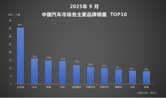 其中,比亚迪汽车(王朝丨海洋)品牌9月销量达35.6万辆,1–9月累计销量298.5万辆,在全市场单一品牌销量排名中稳居冠军,持续巩固头部地位。