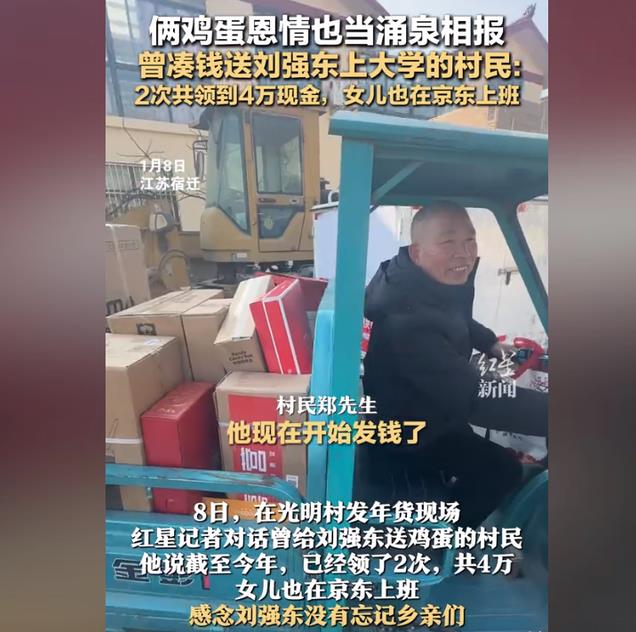 当时给刘强东捐了2个鸡蛋和2毛钱的村民,在这一次中一共领了两次钱,加起来一共4万现金,并且他的女儿现在也在京东上班。