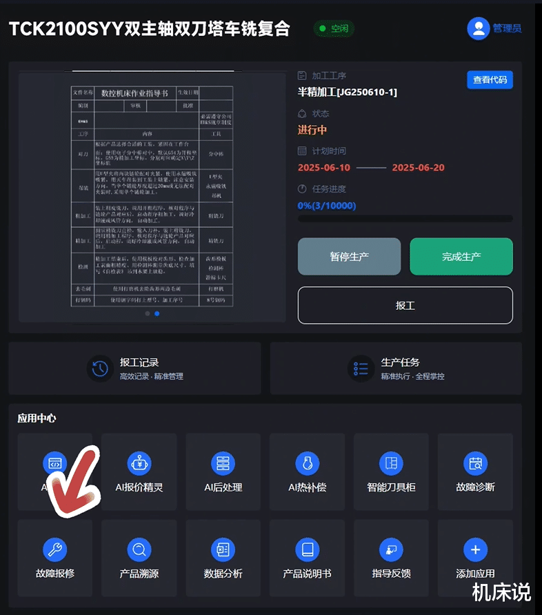 走进大汉智能的合作车间,一台 TCK2100SYY 双主轴双刀塔车铣复合机床正在运转。不同于传统机床故障后需要电话反复沟通的繁琐,这台 AI 机床的操作界面里,“故障报修” 按钮清晰嵌入应用中心。操作员只需三步就能完成报修全流程:第一步点击按钮发起申请,第二步通过文字、语音或视频描述故障,并上传报错截图作为佐证,第三步即可实时追踪工单进度 —— 从 “已受理”“工程师派单” 到 “处理中”“已完成”,每个节点的预计响应时间、负责工程师联系方式都一目了然,维修过程的文字与图片更新也同步展示,无需反复追问就能掌握全局。