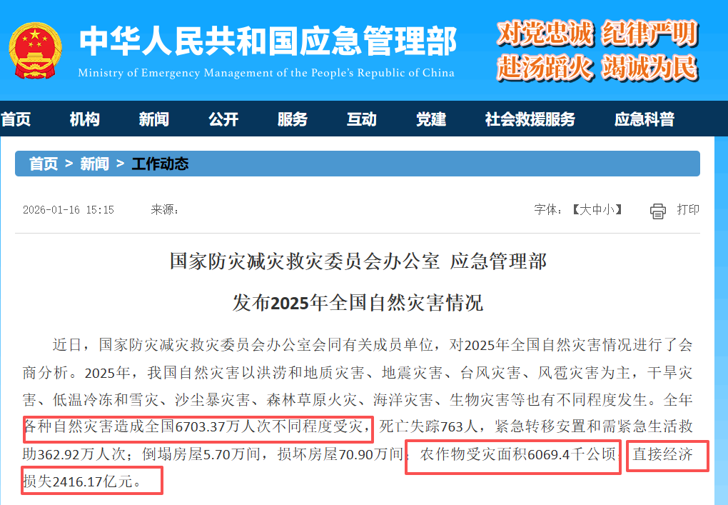 应急管理部发布的2025年数据显示,各类自然灾害致使6703.37万人次受到影响,农作物受灾的面积有6069.4千公顷,造成的直接经济损失是2416.17亿元。