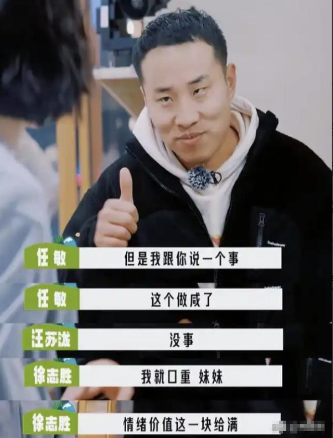 面对任敏因做菜咸了的尴尬,他既用“我口重”化解紧张,又用夸张的“放糖”动作逗笑全场,展现“情绪价值满级输出”的能力。