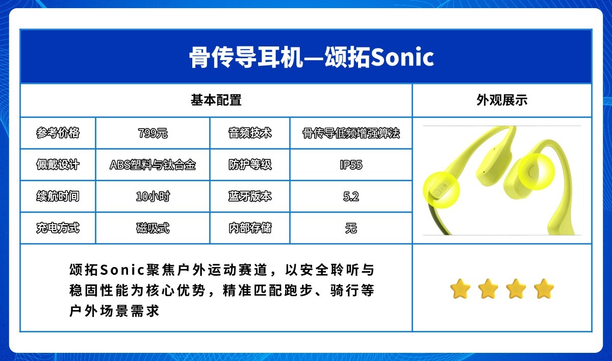 颂拓Sonic聚焦户外运动赛道,以安全聆听与稳固性能为核心优势,精准匹配跑步、骑行等户外场景需求。