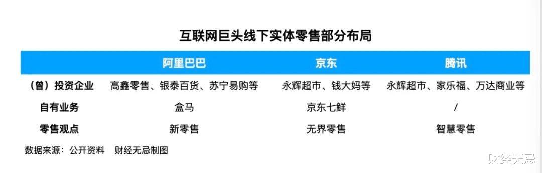 与之对应的是,互联网巨头们对传统零售的大力改造,一面是大举投资实体零售,阿里巴巴入股银泰、收购高鑫零售,投资了苏宁、红星美凯龙等龙头企业;腾讯先后战略投资永辉超市、超级物种、家乐福和万达商业;京东投资了永辉超市、钱大妈;另一面,它们也开始尝试下场做超市,阿里的盒马和京东的七鲜都是新零售时代的产物。
