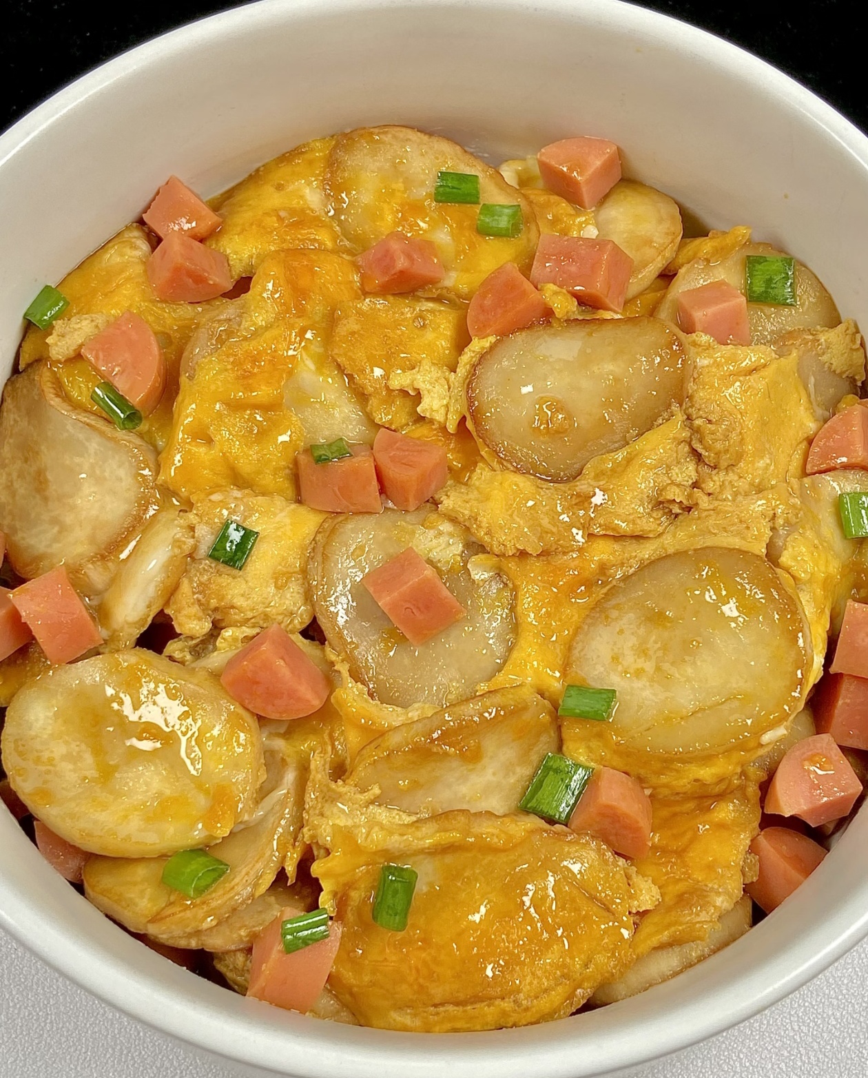 等到酱汁收得差不多时,把切好的香肠碎均匀撒在表面,让咸香的风味融入其中,最后再撒上一把切碎的葱花,翠绿的葱花点缀在金黄的食材上,瞬间提升了菜品的颜值。关火出锅,一道热气腾腾、香气扑鼻的杏鲍菇抱蛋就完成了。