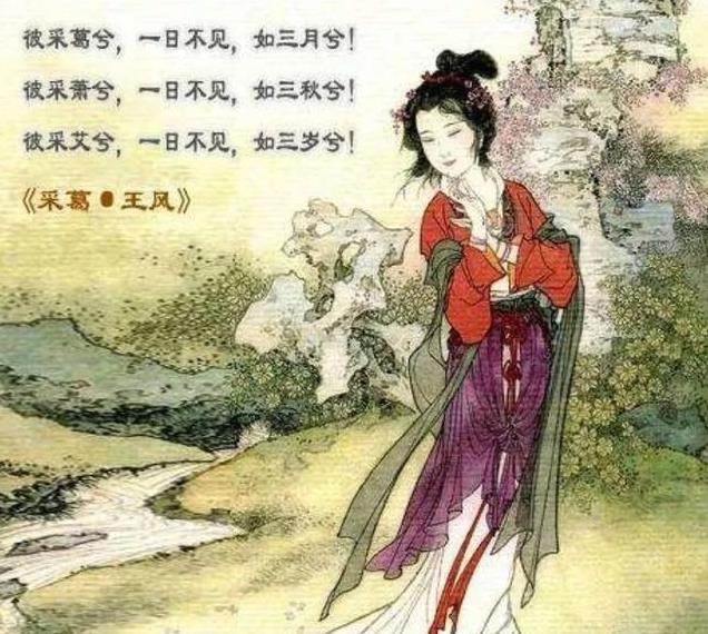 诗中描绘了一位姑娘,分别在采摘葛藤、蒿草和艾草。主人公一天不见她,就思之若狂,仿佛已度过漫长岁月。