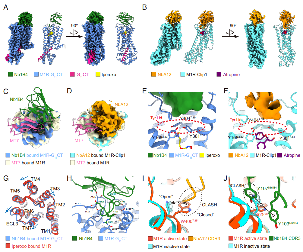 通过这一精巧的筛选流程,成功鉴定出了多个具有构象选择性的纳米抗体。并通过冷冻电镜解析其与M1R的复合物结构,揭示其结合于胞外侧变构口袋,具备明确的构象选择性机制。