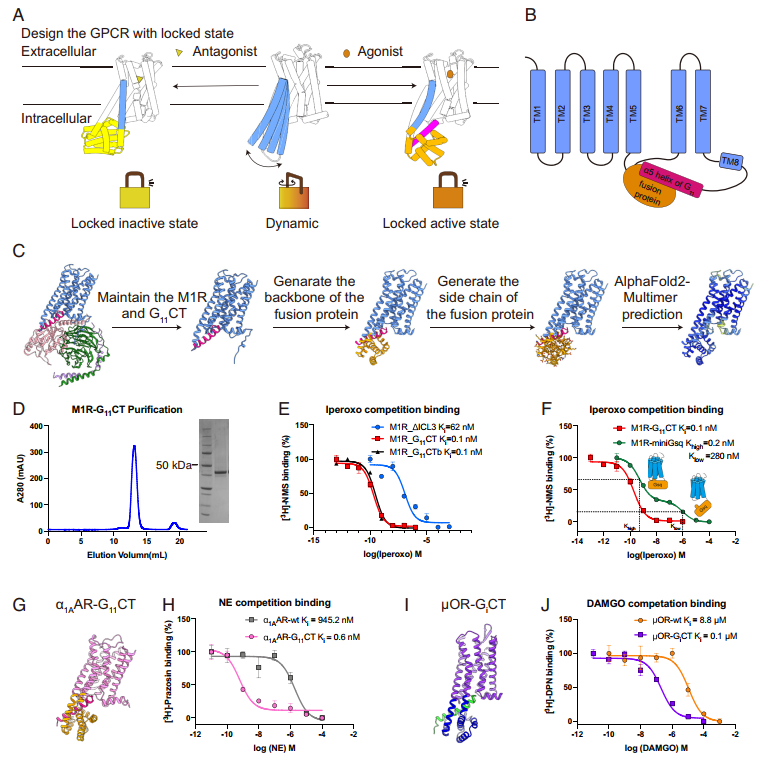 在第二项研究中,团队进一步拓展融合蛋白设计策略,锁定GPCR于激活态构象。通过将G蛋白α5螺旋(G11CT)与受体C端融合,并在TM5/6间插入设计蛋白,构建出无需激动剂即可维持激活态的M1R-G11CT。