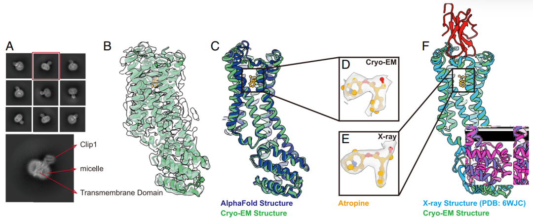 成功解析了M1毒蕈碱受体与拮抗剂阿托品复合物(M1R-Clip1)的冷冻电镜结构,分辨率3.3 Å,与AlphaFold预测模型高度一致,且与已知晶体结构没有显著差异。