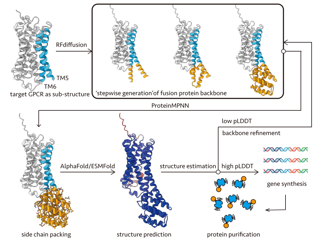 团队以目标GPCR的AlphaFold预测结构为模板,利用RFdiffusion从TM5/6 开始,逐步延伸并构建出一个融合蛋白(Clip)骨架。随后,使用ProteinMPNN为这个骨架设计氨基酸序列,再通过AlphaFold2或ESMFold对设计的序列进行结构预测,并以pLDDT分数评估结构合理性和连接区刚性,选择高 pLDDT 分数进入基因合成、蛋白表达与纯化。