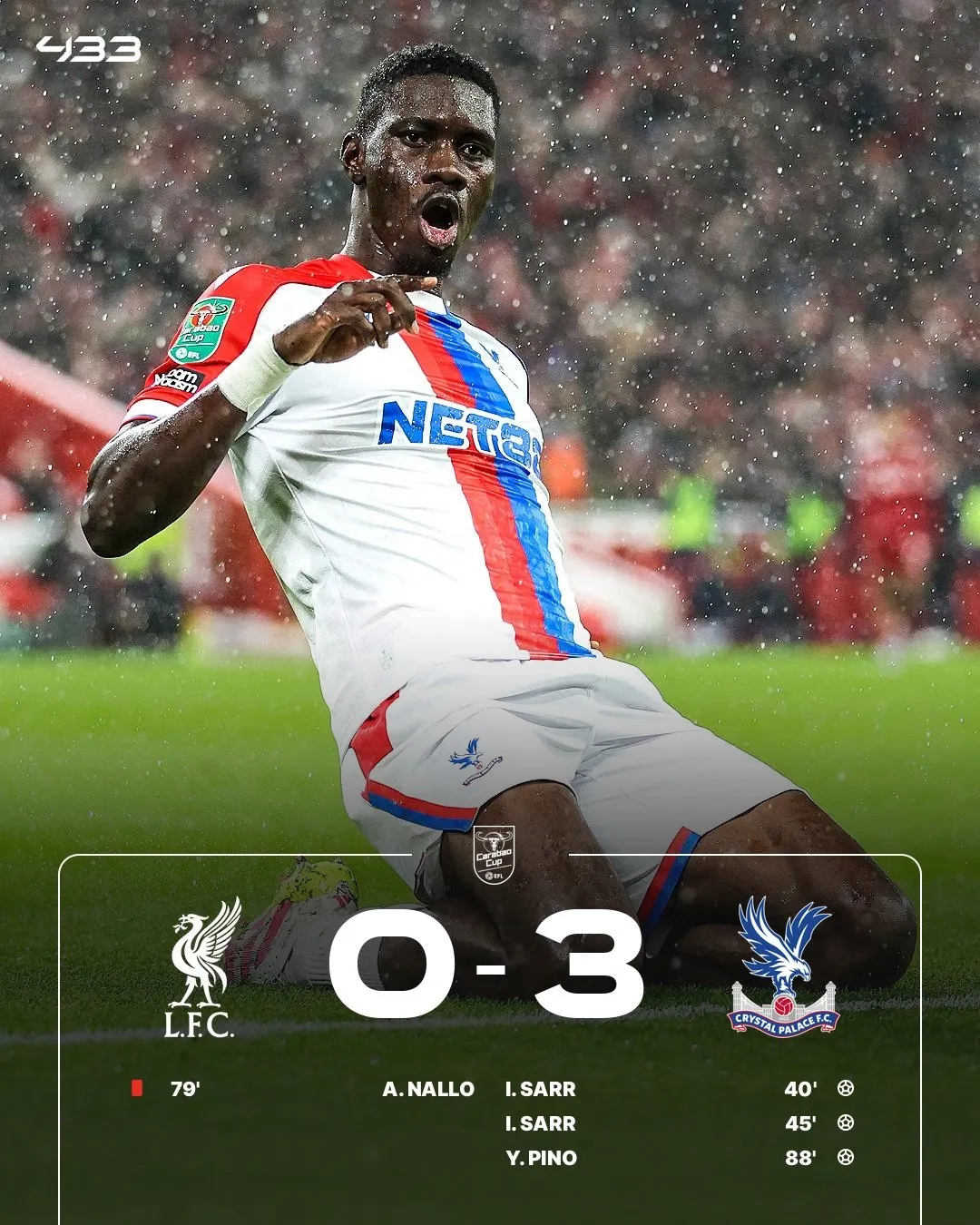 利物浦主场迎战苦主水晶宫,斯洛特本场比赛大幅度轮换,上半场比赛,水晶宫球员伊斯梅拉-萨尔梅开二度。