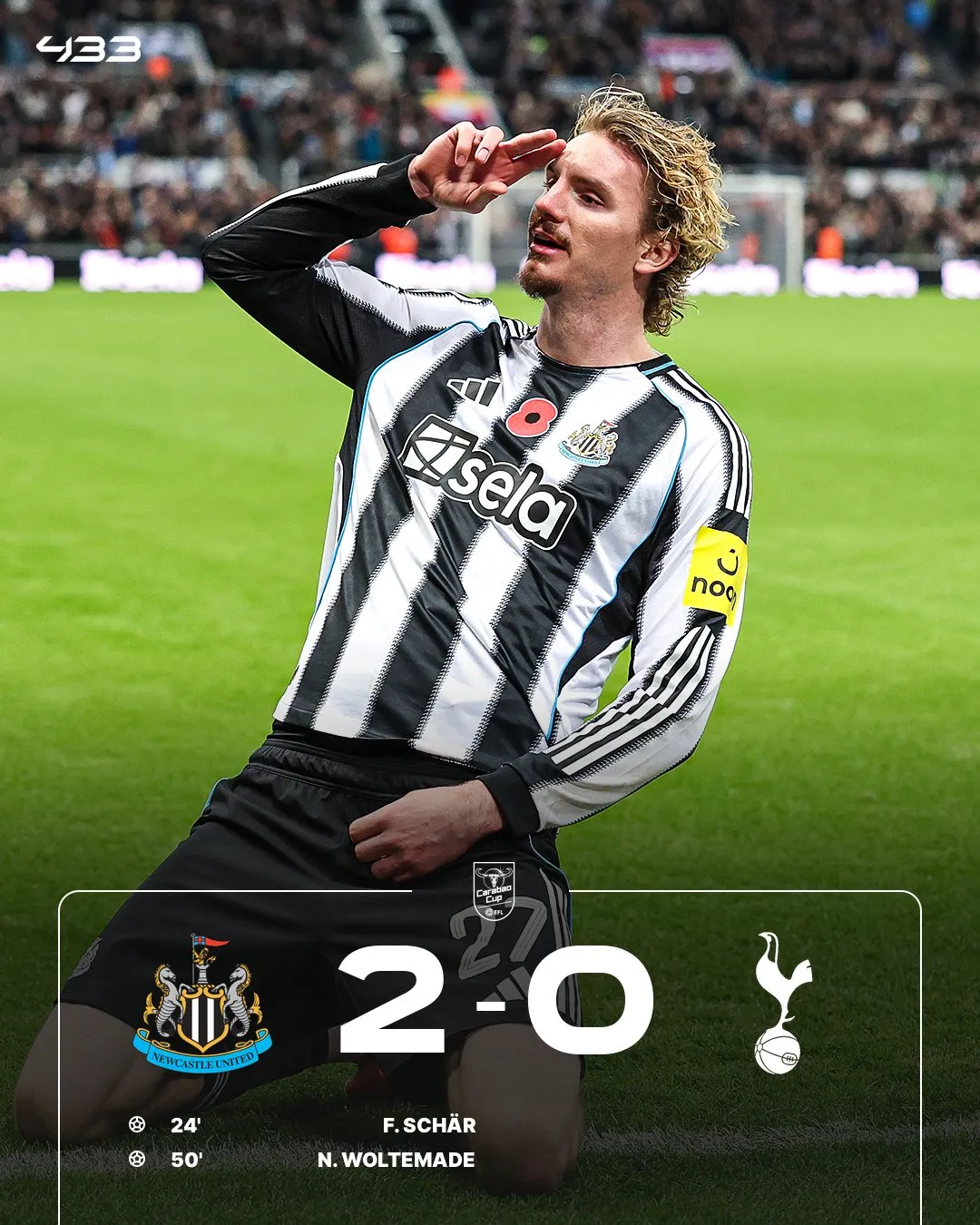 纽卡斯尔联主场迎战热刺。上半场,托纳利送出助攻,法比安-舍尔破门得分。易边再战,沃尔特马德头球破门扩大比分。最终,纽卡斯尔联2-0热刺,晋级下一轮。