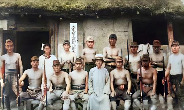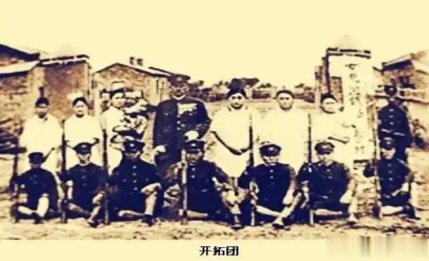 企图用“开拓”二字去掩饰自己的罪行,这张照片就是拍摄的“开拓团”,照片中这些日本人全部手持枪械,带着军帽,中间还坐着一位汉奸,在他们后面的墙上还写着“开拓团”的字样。